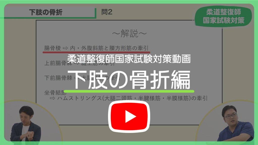 この動画では、大腿骨小転子骨折に関連する 診断のポイント をわかりやすく解説しています。小転子には腸腰筋が付着しているため、その牽引で骨折が起こることがあり、試験でも頻出のテーマです。